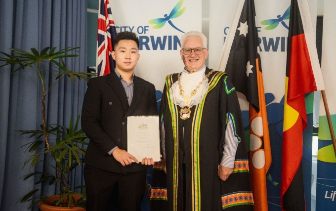 Linh (trái) cùng ngài Thị Trưởng tiểu bang Bắc Australia. Ảnh: Nhân vật cung cấp