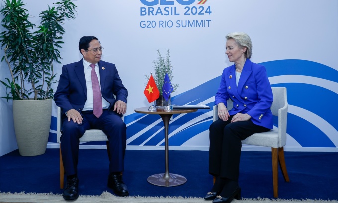 Thủ tướng Phạm Minh Chính gặp Chủ tịch Ủy ban châu Âu Ursula von der Leyen tại Rio de Janeiro,ngày 18/11. Ảnh: Nhật Bắc