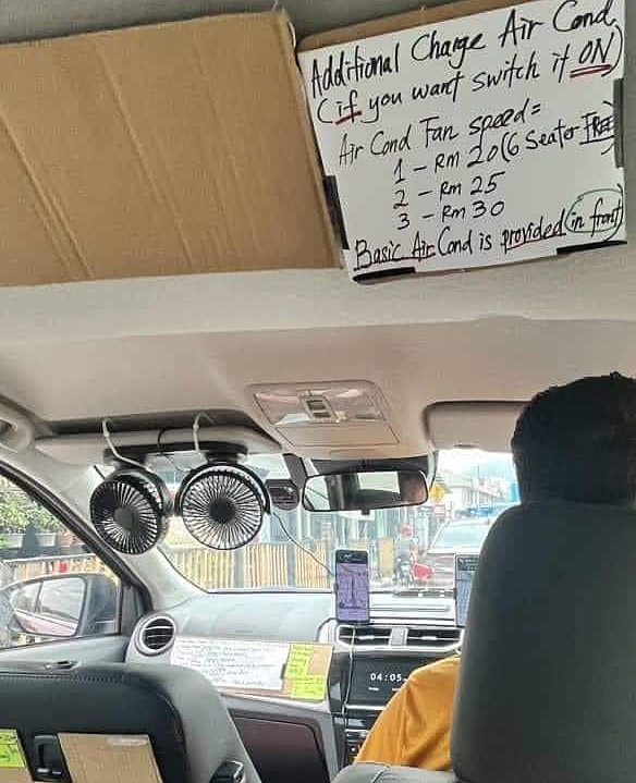 Bức ảnh về việc tài xế taxi tính phụ phí điều hòa gây bức xúc trên mạng xã hội ở Malaysia. Theo đó,thông báo viết tay trên tấm bìa được dán trên trần xe,phía sau tài xế.