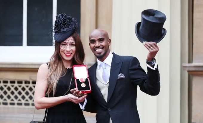 Farah và vợ Tania sau khi được phong tước hiệp sĩ năm 2017. Ảnh: PA