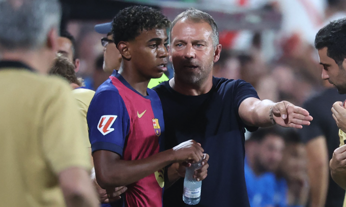 Flick chỉ đạo Lamine Yamal trong trận gặp Rayo Vallecano vào ngày 28/8. Ảnh: AFP