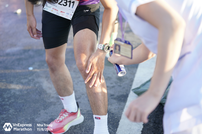 Runner được nhân viên y tế hỗ trợ khi đau nhức chân tại giải VnExpress Marathon ở Nha Trang. Ảnh: VnExpress