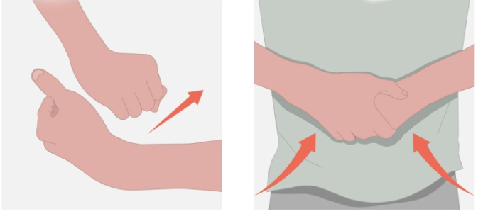 Vòng hai tay ôm lấy thắt lưng trẻ,sau đó nắm chặt bàn tay thành một quả đấm ở vùng thượng vị. Ảnh: Bệnh viện Đa khoa Tâm Anh