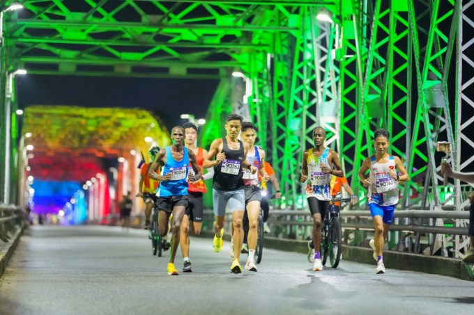 Nguyễn Văn Lai (áo đen) cùng các VĐV top đầu chinh phục cầu Trường Tiền tại VM Huế 2024. Ảnh: VM