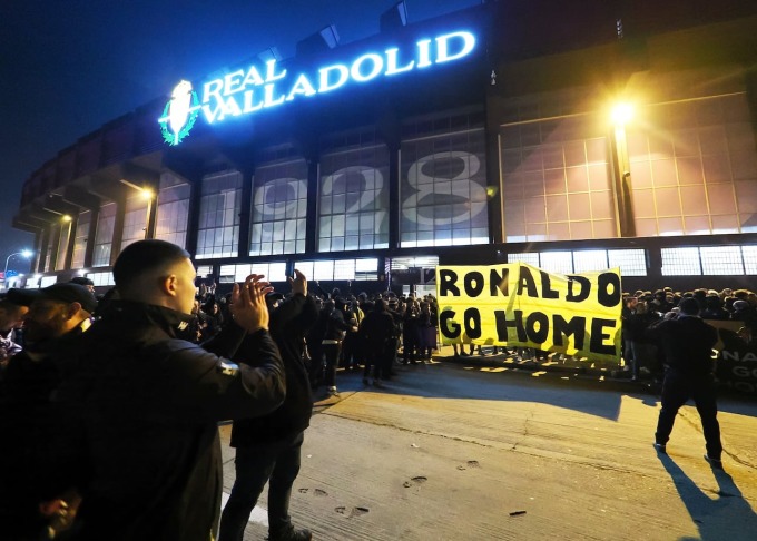 Trong trận đấu giữa Valladolid và Atletico ở vòng 15 La Liga tối 30/11,CĐV chủ nhà dựng băng-rôn với nội dung: "Ronaldo,hãy cút đi","Ronaldo,hãy biến về nhà","Hội đồng quản trị phải từ chức".