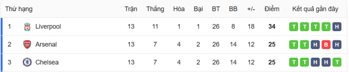 Với 25 điểm mùa này,Arsenal và Chelsea đang chia nhau hai vị trí trong top 3. Đứng đầu vẫn là Liverpool với 34 điểm. Giữa tuần này,ở vòng 14,Arsenal tiếp Man Utd,còn Chelsea làm khách của Southampton.