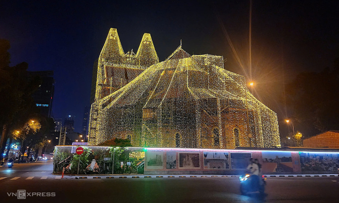 Hệ thống dàn đèn lắp đặt trên giàn giáo xung quanh nhà thờ hoàn thiện vào tối qua. Linh mục Ignatio Hồ Văn Xuân,Trưởng ban trùng tu nhà thờ,cho biết năm nay nhà thờ trang hoàng phía trước,phía sau và hai bên hông công trình nên cần đến 500.000 m dây đèn LED. Ở giữa hai tháp chuông có gắn ngôi sao Giáng sinh Bethlehem với ánh đèn nhiều màu sắc.