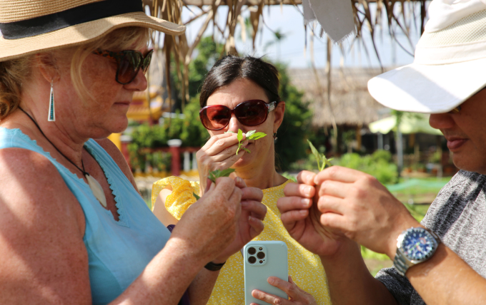 Du khách thử mùi rau thơm tại làng rau Trà Quế hồi tháng 11. Ảnh: Đắc Thành