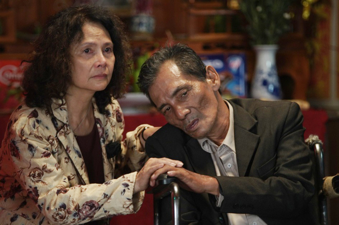 Diễn viên Thương Tín trong một cảnh quay cùng nghệ sĩ Minh Châu ở phim "Culi không bao giờ khóc" - phim ông đóng vai phụ,ra rạp vào tháng 11. Ông đóng một bệnh nhân hiểm nghèo,phải ngồi xe lăn. Thời điểm,sức khỏe của nghệ sĩ đã nhiều phần giảm sút. Ảnh: Đoàn phim cung cấp
