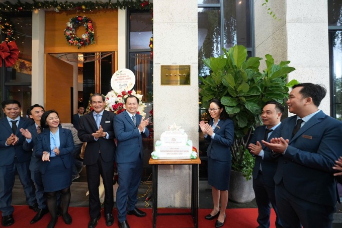 Lãnh đạo ngành du lịch và đại diện Anya Premier gắn biển 5 sao cho khách sạn,sáng 12/12. Ảnh: Anya