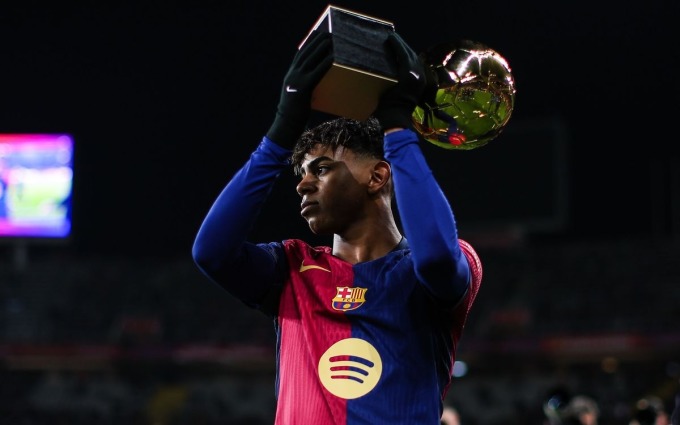 Yamal khoe danh hiệu Cậu Bé Vàng 2024 trước trận Barca - Leganes hôm 15/12. Ảnh: FCB