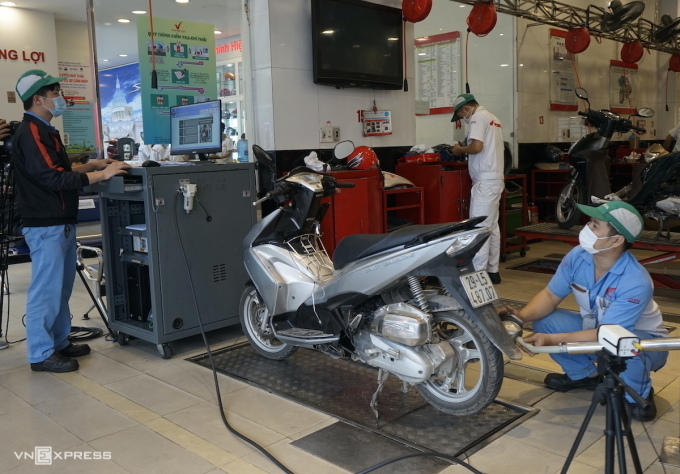 Kiểm tra khí thải xe máy tại một đại lý ở Hà Nội năm 2021. Ảnh: Gia Chính