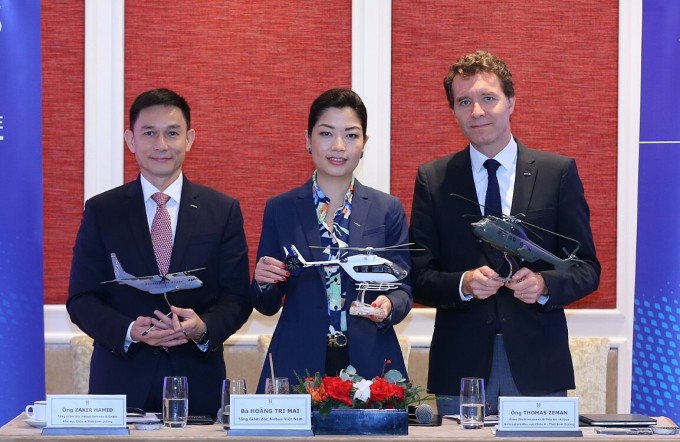 Bà Hoàng Tri Mai,Tổng giám đốc Airbus tại Việt Nam (giữa),giới thiệu về các sản phẩm của tập đoàn. Ảnh: Airbus