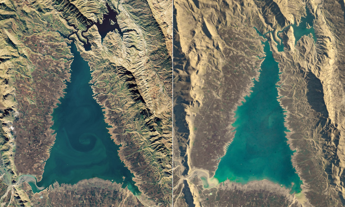 Hồ Dukan trông giống cây thông Noel khi chụp từ Trạm Vũ trụ Quốc tế (ISS). Ảnh: NASA Earth Observatory