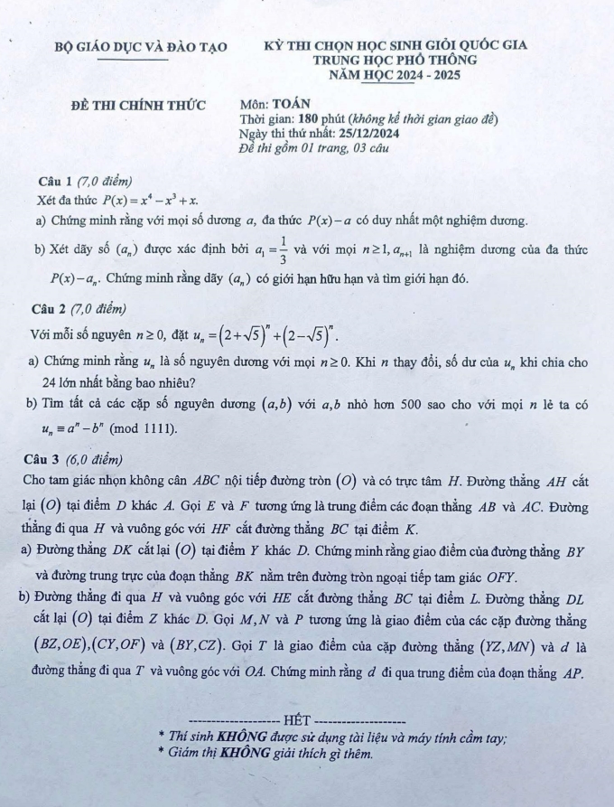 Dưới đây là lời giải chi tiết đề Toán thi học sinh giỏi quốc gia năm học 2024 -2025 ngày thứ nhất,của thầy Võ Quốc Bá Cẩn,Nguyễn Lê Phước,Phan Quang Linh (trường Archimedes Academy),Trần Quang Độ,Vũ Minh Đức,Phan Quang Đạt (CLB CMATH) và Đào Phúc Long (sinh viên Đại học Bách khoa Hà Nội):