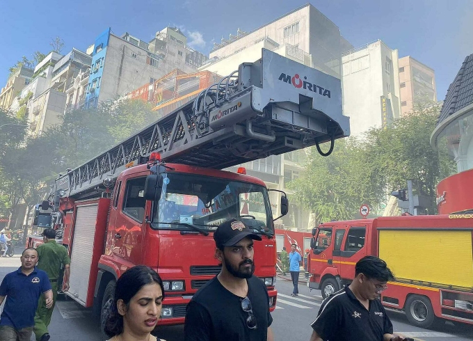 Cảnh sát PCCC điều xe thang đến hiện trường ứng cứu. Ảnh: Thanh Tùng