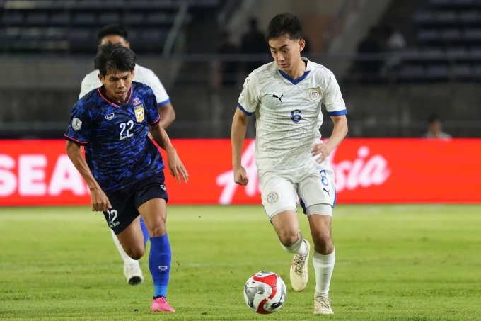 Tiền vệ Sandro Reyes (phải) đi bóng trong trận gặp Lào trên sân Quốc gia ở Vientiane,tối 15/12/2024. Ảnh: Rappler