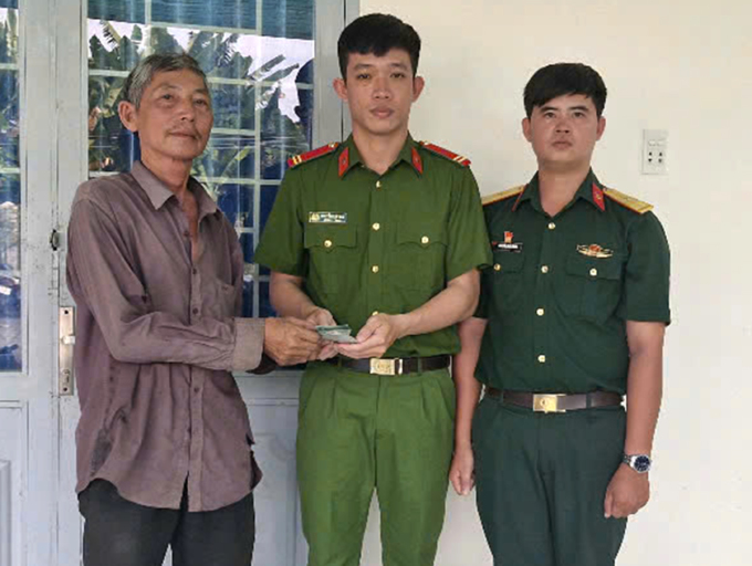 Thiếu úy Nguyễn Hoài Trung (bìa phải) cùng công an trao trả lại tài sản. Ảnh: Minh Trí