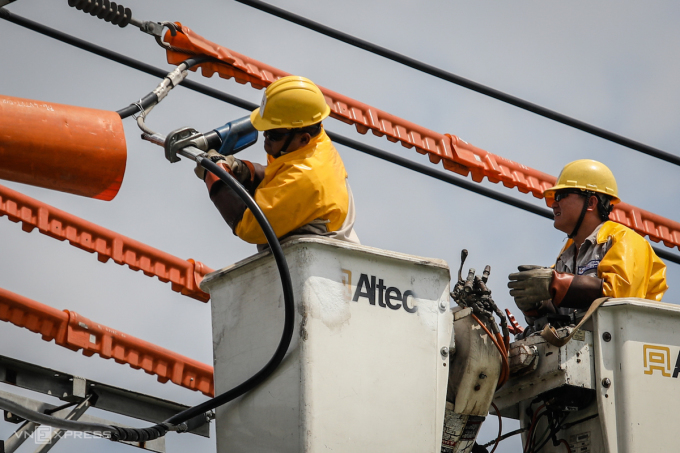 Công nhân Điện lực TP HCM sửa chữa điện nóng trên đường dây 22kV tại khu chế xuất Tân Thuận (quận 7,TP HCM). Ảnh: Thành Nguyễn