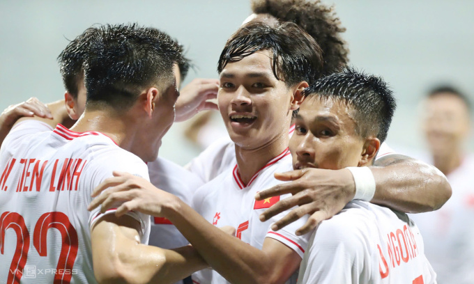Cầu thủ Việt Nam mừng bàn thắng của Nguyễn Xuân Son trong trận thắng Singapore trên sân Jalan Besar tối 26/12/2024. Ảnh: Hiếu Lương