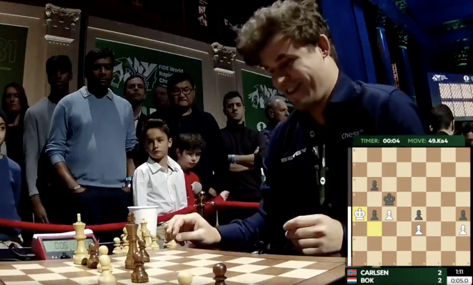 Carlsen bật cười trong ván hòa Benjamin Bok ở giải cờ chớp thế giới tại Phố Wall,thành phố New York,Mỹ ngày 30/12/2024. Ảnh: chụp màn hình