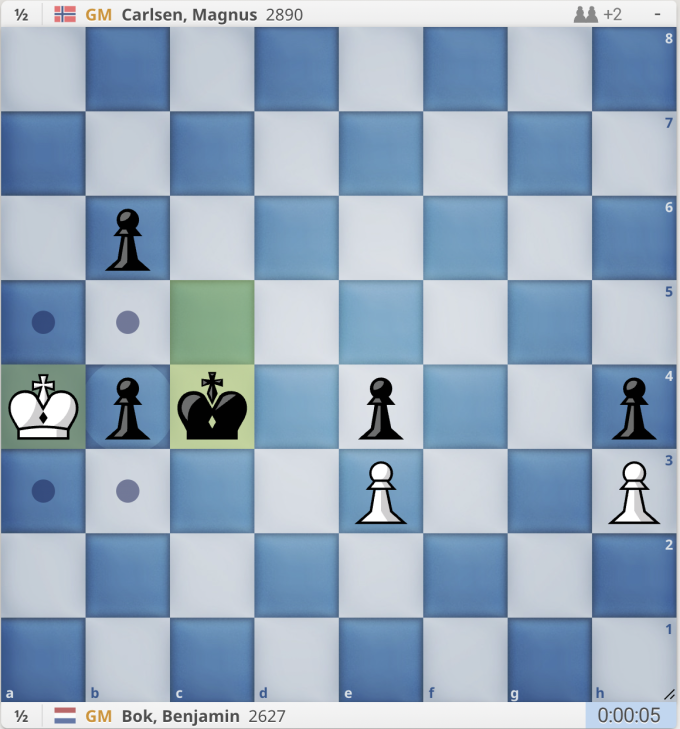 Thế cờ sau nước 48.Kxb3. Đây là hình cờ đối vua cơ bản trong tàn cuộc,và Đen chắc chắn sẽ bắt được tốt trắng c4 do có lợi thế về nước đi trung gian của tốt b7. Lúc này,nếu Carlsen đẩy tới b6 thì hòa,đẩy lên b5 mới thắng.