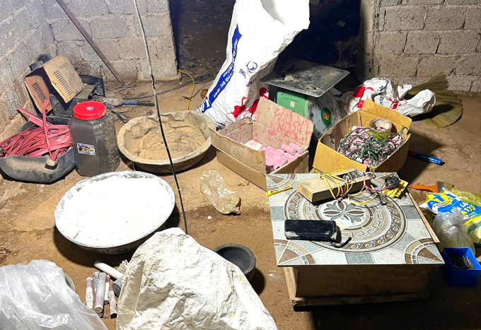 Một số tang vật dùng để chế tạo pháo được cảnh sát tịch thu tại lán của Thắng. Ảnh: Quỳnh Trang