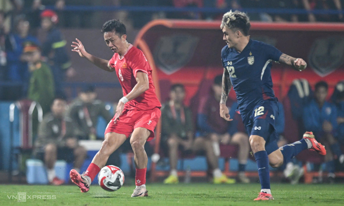 Tiền vệ Châu Ngọc Quang chuyền bóng trong trận gặp Thái Lan trên sân Việt Trì,tỉnh Phú Thọ,lượt đi chung kết ASEAN Cup 2024 tối 2/1/2025. Ảnh: Giang Huy