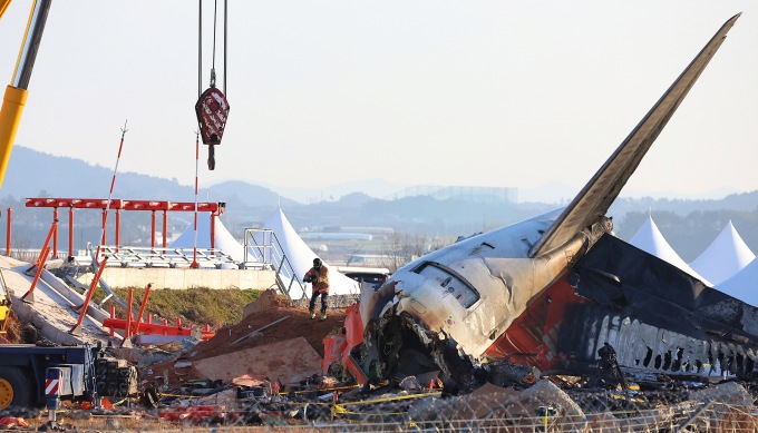 Sử dụng một chiếc cần cẩu lớn màu vàng,giới chức Hàn Quốc chiều 3/1 bắt đầu nhấc phần đuôi cháy sém và các bộ phận khác của máy bay,trong đó có động cơ,lên khỏi mặt đất để phục vụ công tác điều tra và tìm kiếm thi thể nạn nhân.