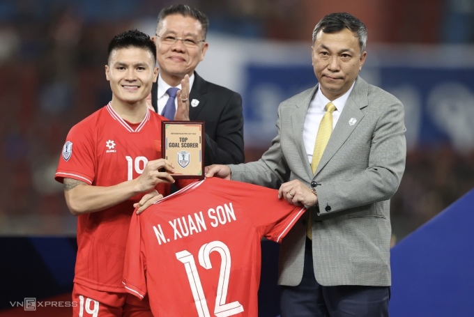 Tiền vệ Nguyễn Quang Hải (trái) lên thay Nguyễn Xuân Son nhận danh hiệu Cầu thủ hay nhất và Vua phá lưới ASEAN Cup 2024. Ảnh: Đức Đồng