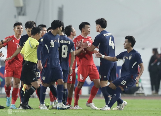 Trung vệ Nguyễn Thành Chung (số 16) nổi cáu với cầu thủ Thái Lan sau khi Supachok Sarachat ghi bàn nâng tỷ số lên 2-1,trong trận Việt Nam thắng 3-2 ở lượt về chung kết ASEAN Cup 2024. Ảnh: Hiếu Lương