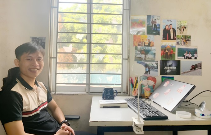 Dù chuyển qua các phòng trọ khác nhau,Quyết luôn treo cạnh bàn làm việc những bức ảnh người thân,các anh chị ở Blue Dragon và những câu nói truyền động lực. Ảnh: Hương Nguyễn