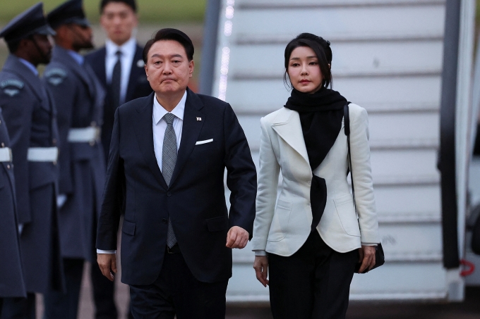 Tổng thống Hàn Quốc Yoon Suk-yeol và Đệ nhất phu nhân Kim Keon-hee tại Anh hồi tháng 11/2023. Ảnh: Reuters