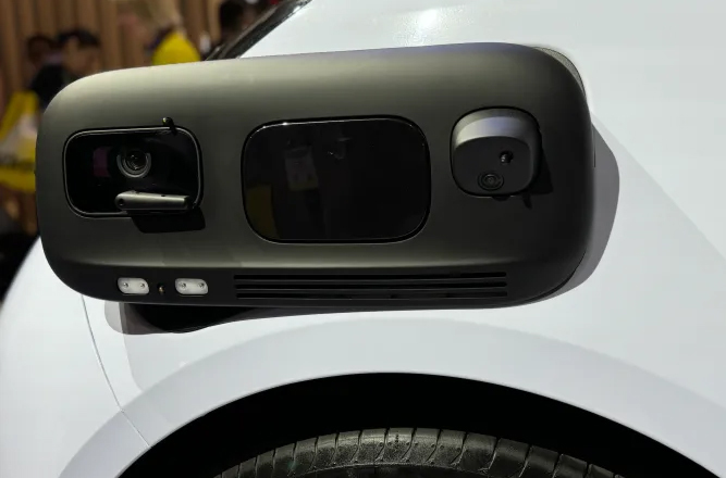 Bộ cảm biến gồm camera và radar phía trên chắn bùn trước bên trái. Ở camera có cần gạt nhỏ để làm sạch. Ảnh: TechCrunch