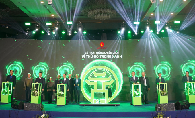 Các đại biểu nhấn nút phát động chiến dịch "Vì Thủ đô trong xanh". Ảnh: Hoàng Phong