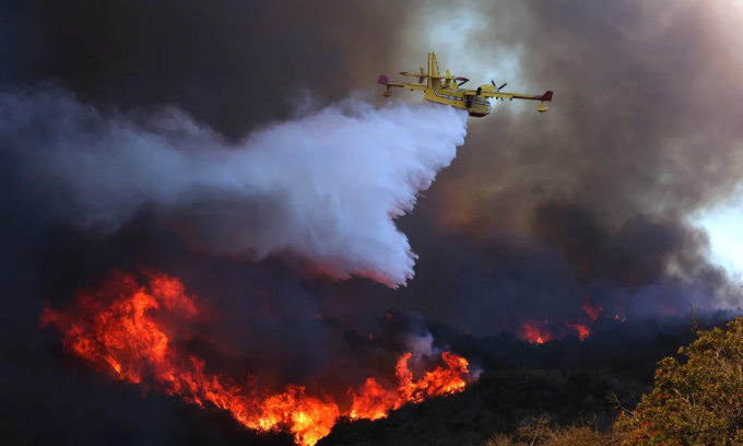 Máy bay xả nước xuống đám cháy Palisades ở Pacific Palisades,Los Angeles,Mỹ. Ảnh: Brian van der Brug/Los Angeles Times
