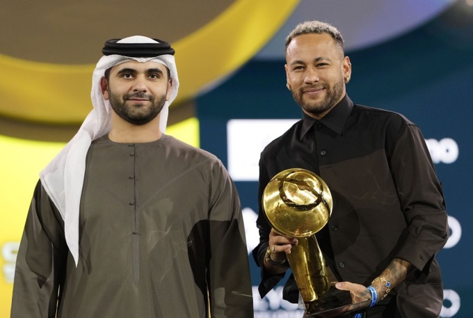 Neymar (phải) giành giải thưởng Thành tựu sự nghiệp tại Gala Globe Soccer 2024. Ảnh: GSA
