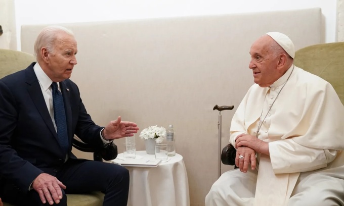 Tổng thống Mỹ Joe Biden (trái) gặp Giáo hoàng Francis tại Savelletri,Puglia,Italy,tháng 6/2024. Ảnh: AP