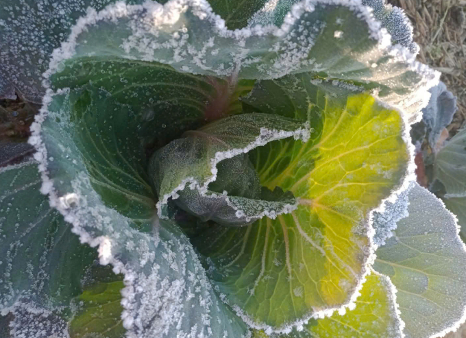 Tại vườn nhà dân,băng giá cũng bám phủ trên hoa màu. Ảnh: Hùng Lê