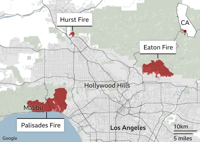 Vị trí các đám cháy ở Los Angeles. Theo BBC