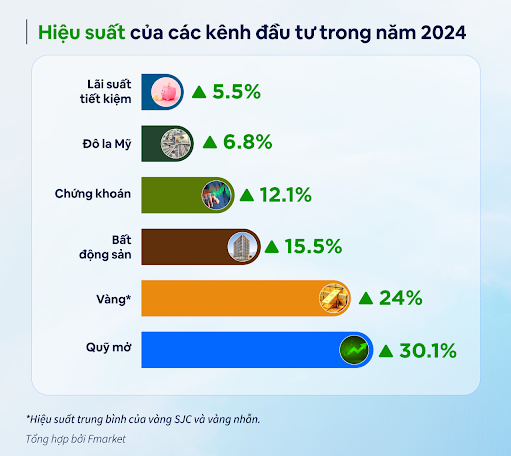 Trong bảng thống kê mới nhất của Fmarket,giá các tài sản tại Việt Nam trong năm 2024 trung bình tăng 10-30% nhờ vào nền lãi suất thấp và các chính sách tài khóa nới lỏng. Nhà đầu tư chứng kiến sự tăng giá của vàng,bất động sản ở một số khu vực. Đặc biệt thị trường chứng khoán trong nước tăng trưởng dù toàn thị trường nhiều biến động khó lường. Trong đó,"quán quân" về hiệu suất đầu tư của năm 2024 thuộc về các nhà đầu tư chứng chỉ quỹ với lợi nhuận lên đến 34%. Có hơn 13 quỹ trên Fmarket đạt lợi nhuận hơn 20% - vượt trội so với mức 12% của thị trường chứng khoán.
