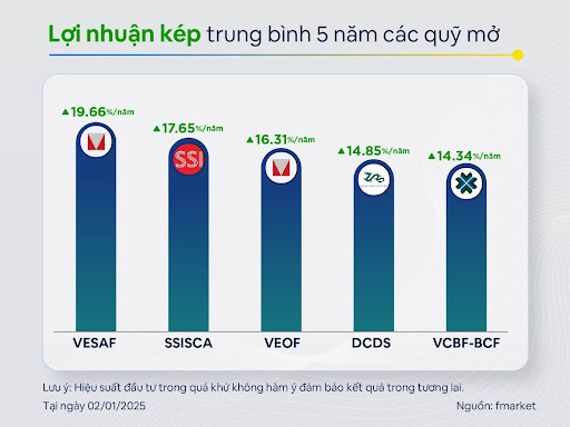 Không riêng 2024,trong 5 năm qua quỹ mở vẫn cho hiệu suất tốt và ổn định dù thị trường biến động mạnh. Một số quỹ ghi nhận lợi nhuận kép trung bình tốt như: VESAF (19,66%),SSISCA (17,65%),VEOF (16,31%),DCDS (14,85%),VCBF-BCF (14,34%). Việc lựa chọn các quỹ đầu tư hàng đầu trên thị trường cũng giúp nhà đầu tư tối ưu lợi nhuận trong dài hạn,tránh những rủi ro trên thị trường tài chính.