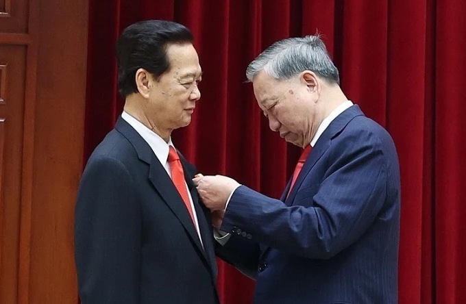 Tổng Bí thư Tô Lâm trao Huân chương Sao Vàng tặng nguyên Thủ tướng Nguyễn Tấn Dũng. Ảnh: TTXVN