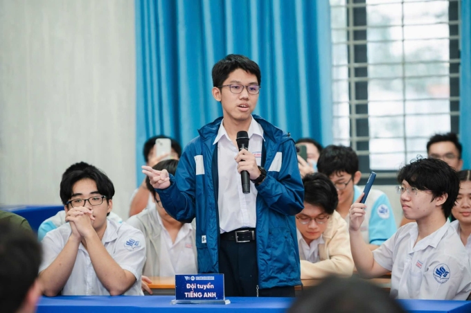 Gia Bảo (giữa) trong buổi xuất quân của đội tuyển trường Phổ thông Năng khiếu,tháng 12/2024. Ảnh: Nhân vật cung cấp