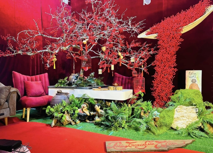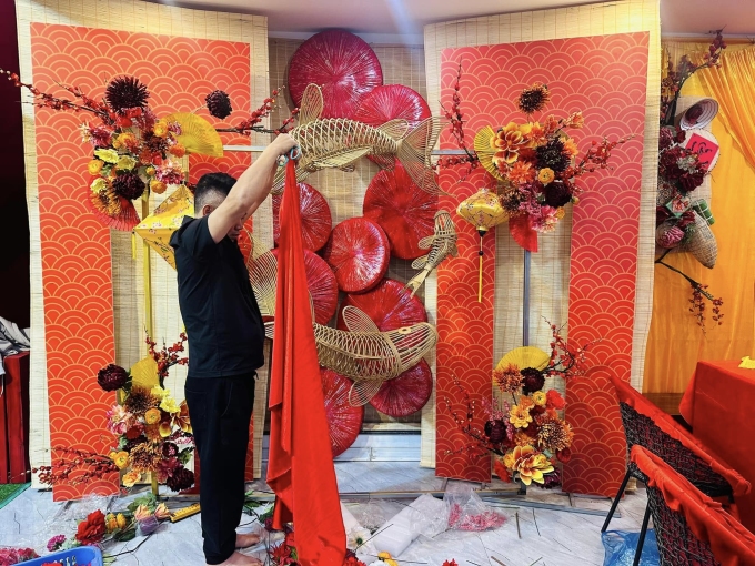 Anh treo mành tre hai bên cánh cửa,gắn đôi cá chép ở giữa cùng bàn ghế cho khách đến vừa chụp ảnh vừa thưởng trà. Ngoài sân,anh dựng chòi lợp mái lá,treo chữ "Chúc mừng tân xuân",đặt thêm mô hình nồi nấu bánh chưng,gánh bưởi,rau để có thêm bối cảnh Tết xưa.