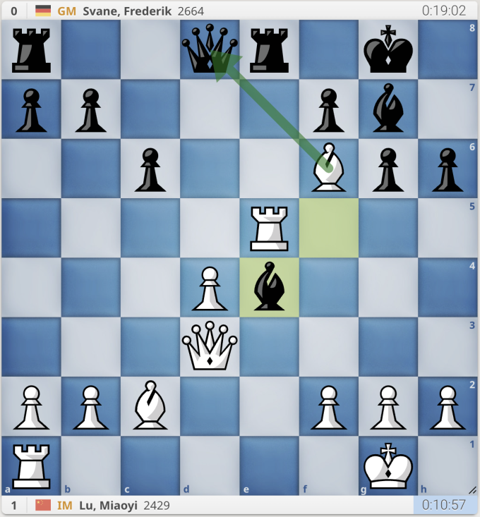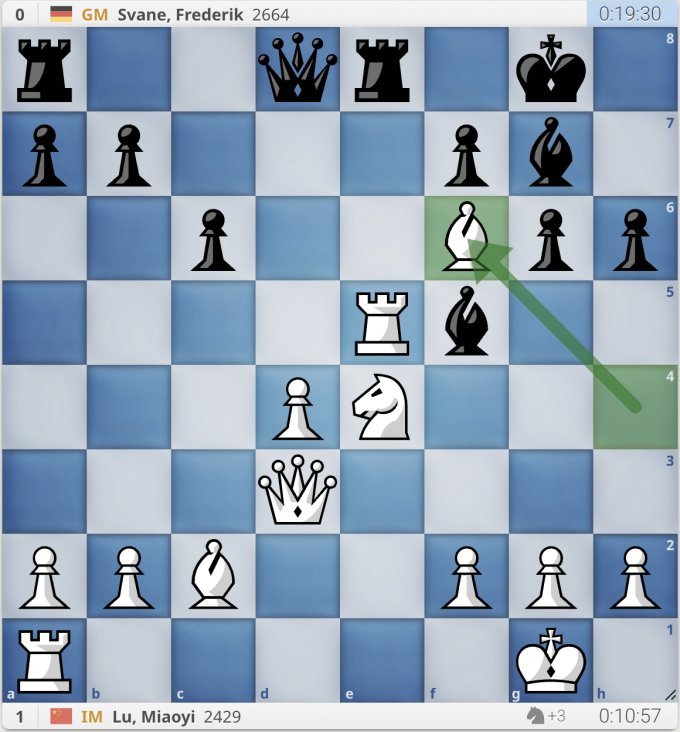 Lu Miaoyi (Lộc Diệu Di) cầm quân trắng,gặp đối thủ hơn cô tới 235 Elo ở vòng ba tối 20/1. Ở nước 20 khi cờ cân bằng,Svane đưa tượng từ e6 lên f5,với mục đích ghim mã,mà không nhận ra nước đi này là sai lầm chí mạng khiến anh thất bại.