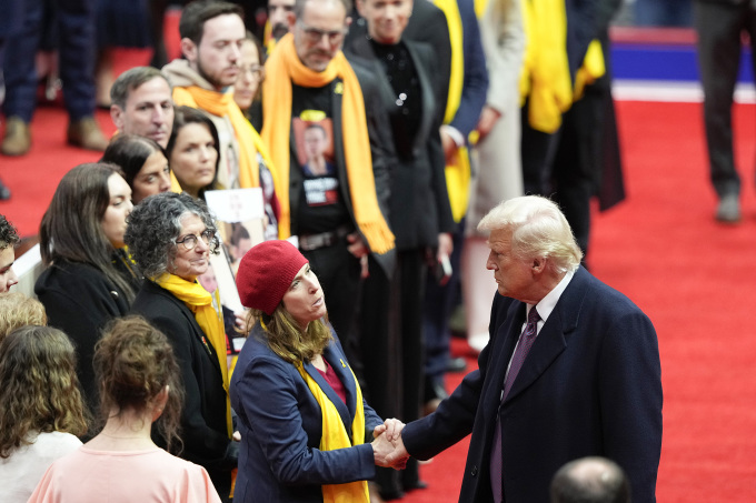 Ông Trump bắt tay một thành viên gia đình của con tin bị giam ở Dải Gaza,ngày 20/1. Ảnh: AP