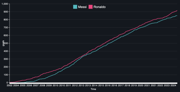 Số bàn thắng của Messi và Ronaldo theo thời gian. Ảnh: MvR