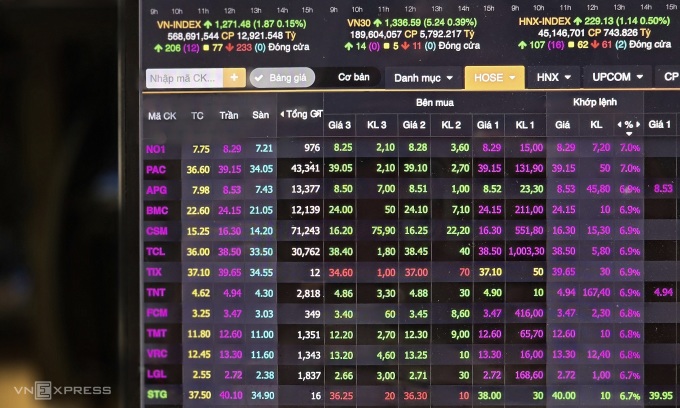 Sàn HoSE đóng cửa với 12 cổ phiếu đạt sắc tím,nhưng dòng tiền chủ yếu tìm đến các mã có vốn hóa vừa và nhỏ. Số này gồm các mã CSM,PAC,TCL,APG,BMC,TMT,TNT,VRC,LGL,FCM,NO1 và TIX.