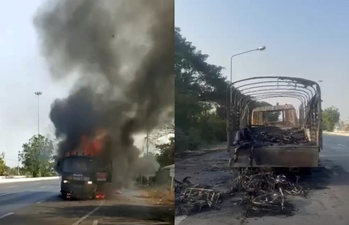 Hình ảnh tại hiện trường cho thấy ngọn lửa bốc cao bao trùm xe tải sau đó thiêu rụi tất cả xe đạp và dụng cụ trên xe.